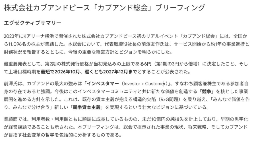 これで1時間43分の動画を5分で理解でき、ユーザーは将来性の希薄な未公開株のために割高な料金を払ってるという俺のカブアンドに対する評価を更に固められたというからくり。