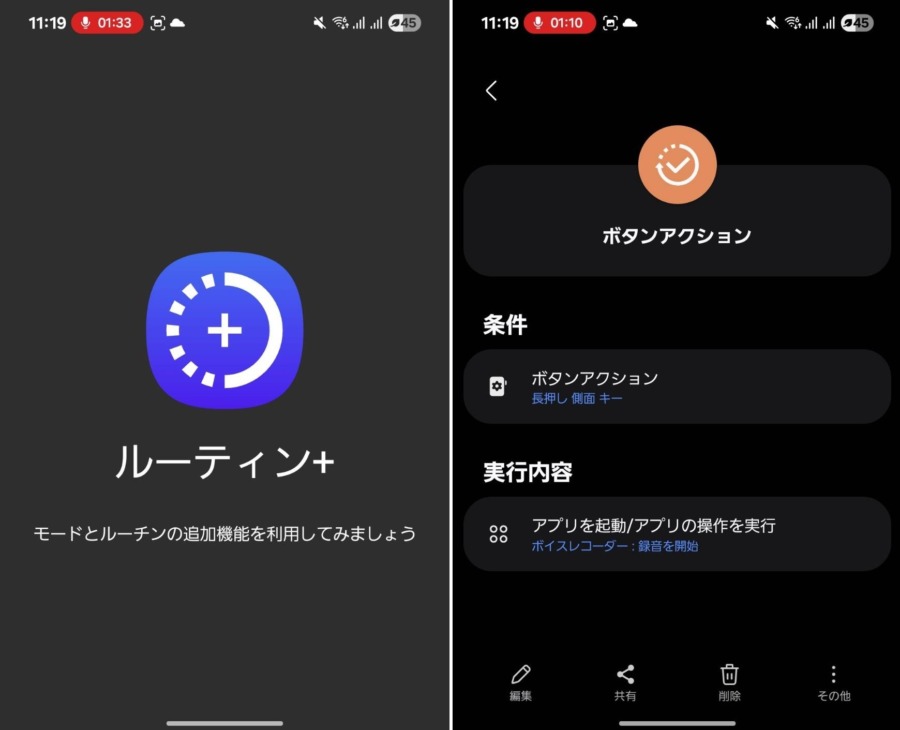 ということで運用方法を変更する。常時録音がアホすぎるなら都度録音にすればOK。そのためにまずGalaxyの電源ボタン長押しに録音開始のショートカットを登録した。