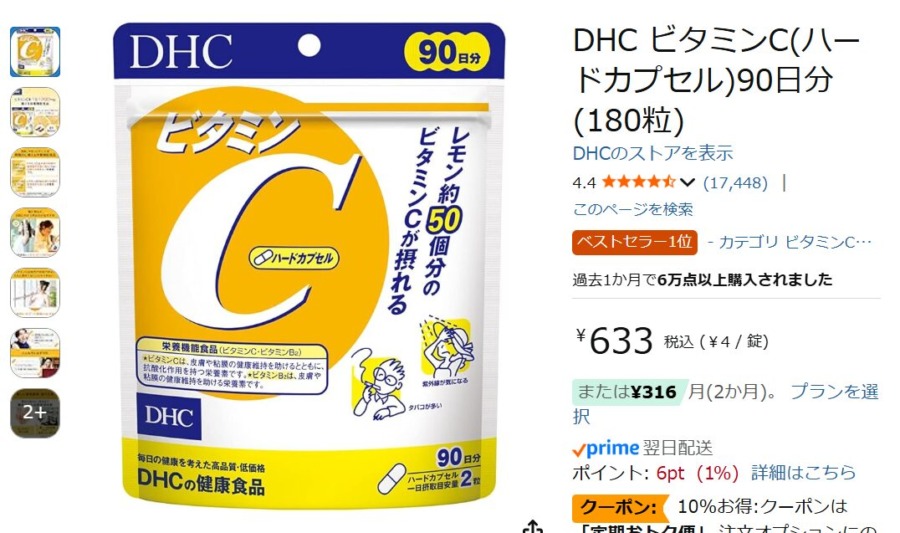 実際薬局に行ってもビタミンCが最も安い錠剤として売られているんだけど正直何でもいい。よく見るDHCのやつでも1カプセル500mgだから十分すぎる。これで既に一日分の推奨量の5倍量になる。でもビタミンCは6時間で完全に排出されるから、これを一日4回から5回飲めばOK。