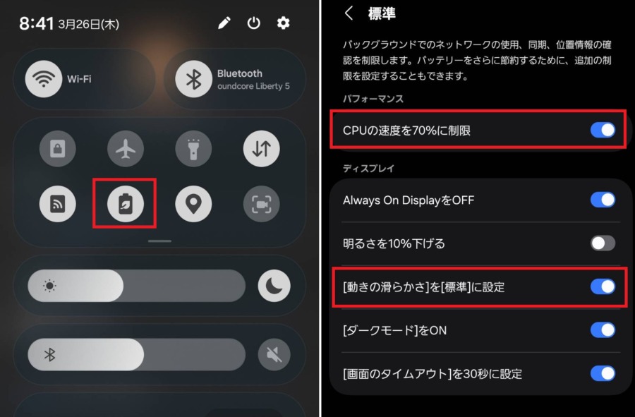 省電力モードはクイックメニューから簡単にオンオフができるから、普段はオンで、ゲームをしたいときとかだけオフにすればOK。