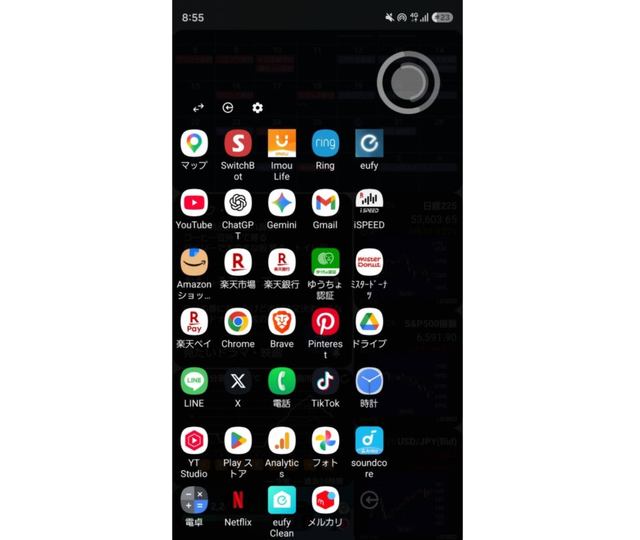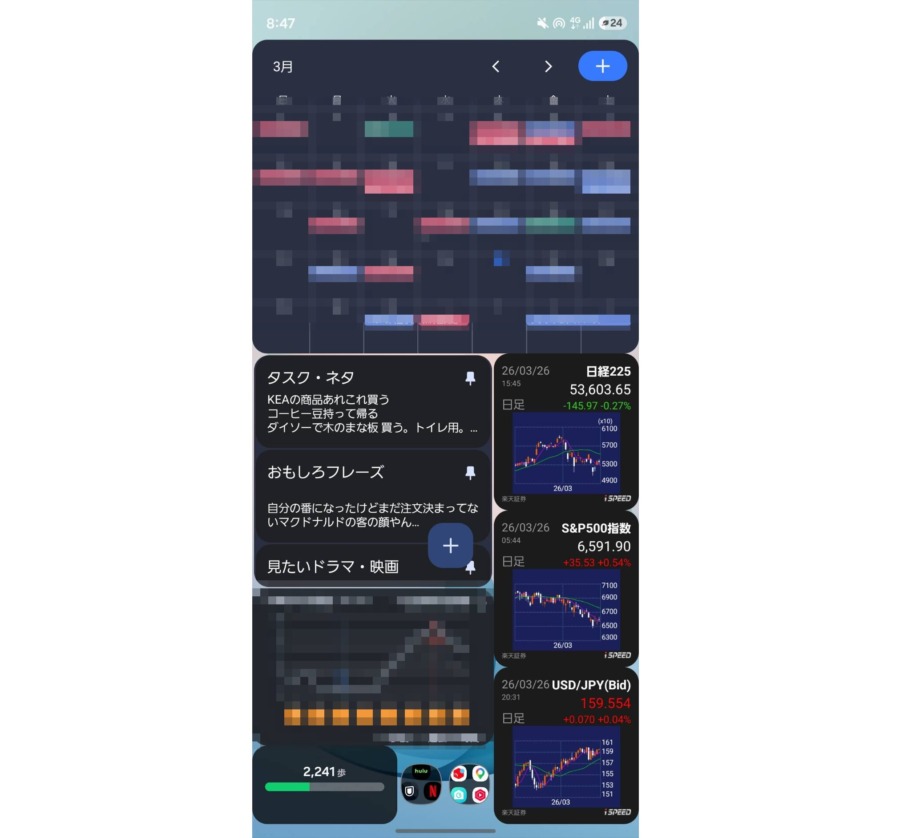 画面の上半分が妻と共有しているグーグルカレンダーの月予定。真ん中左がGoogleKeepのメモ。その下がウェザーニュースの現在地の先24時間天気ウィジェット、右側は楽天iSpeedの日経平均、SP500、ドル円の現在価格で、左下が今日の歩数、一番下のフォルダがあまり使わないアプリまとめという感じ。ここで今月の予定とか近々のタスク、株価の上げ下げと今日の歩数を確認してる。