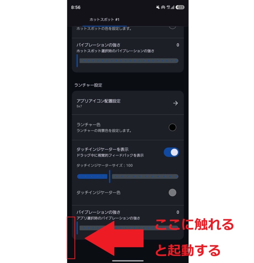 但しSwipePad+のホットスポットは側面に沿わせすぎるとジェスチャーの戻ると干渉するから注意。通常使用時に最も触れる頻度が少ない左下辺りに、太め、短めのホットスポットを設置すると快適にアクセスできるからお勧め。